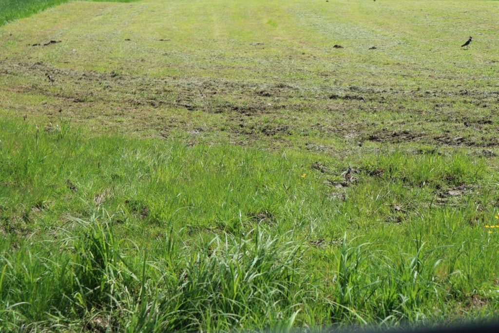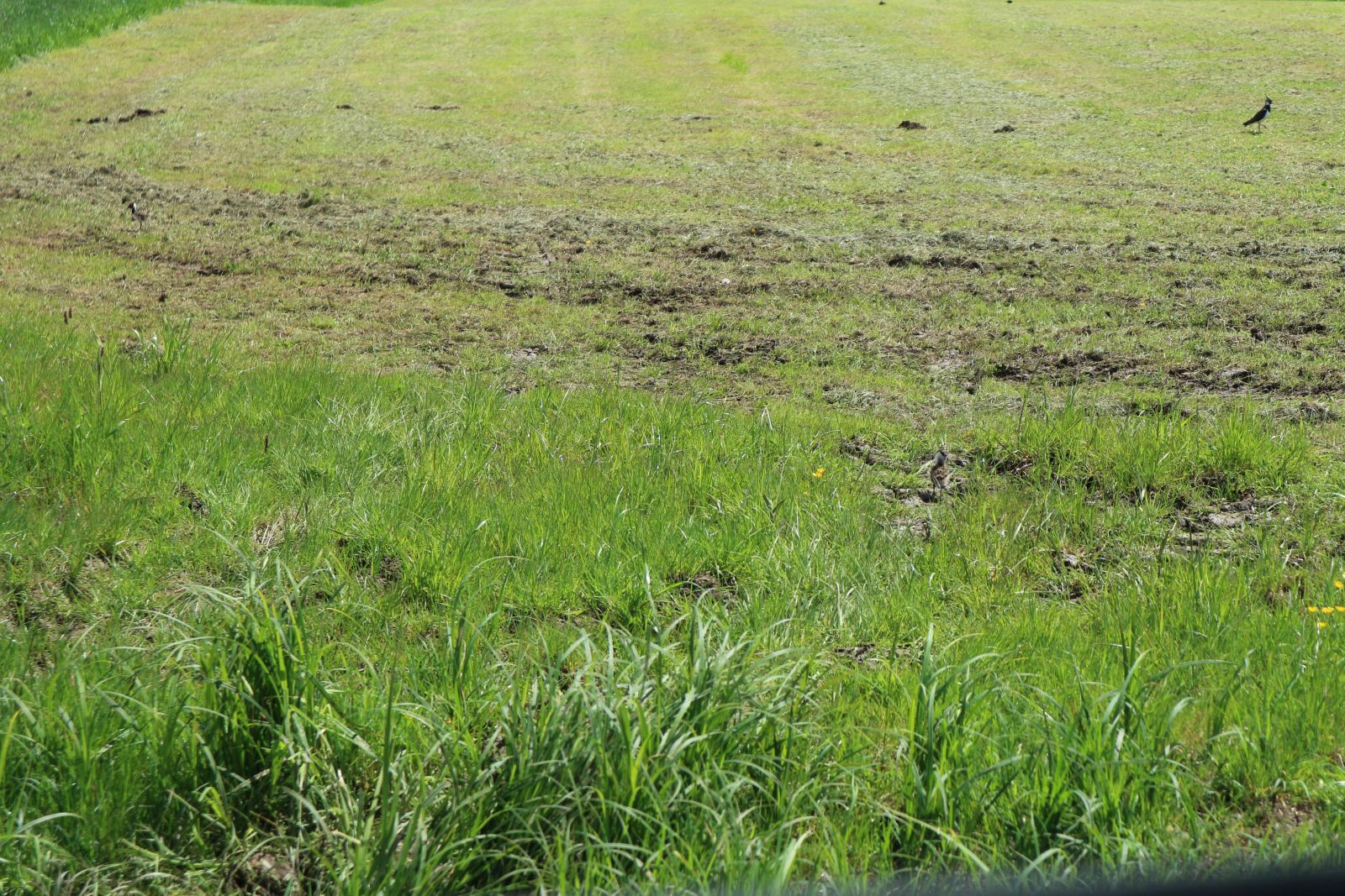 Küken-Suchbild: Wer findet die beiden Kiebitzküken? Rechts im Hintergrund übrigens ein Elternteil.