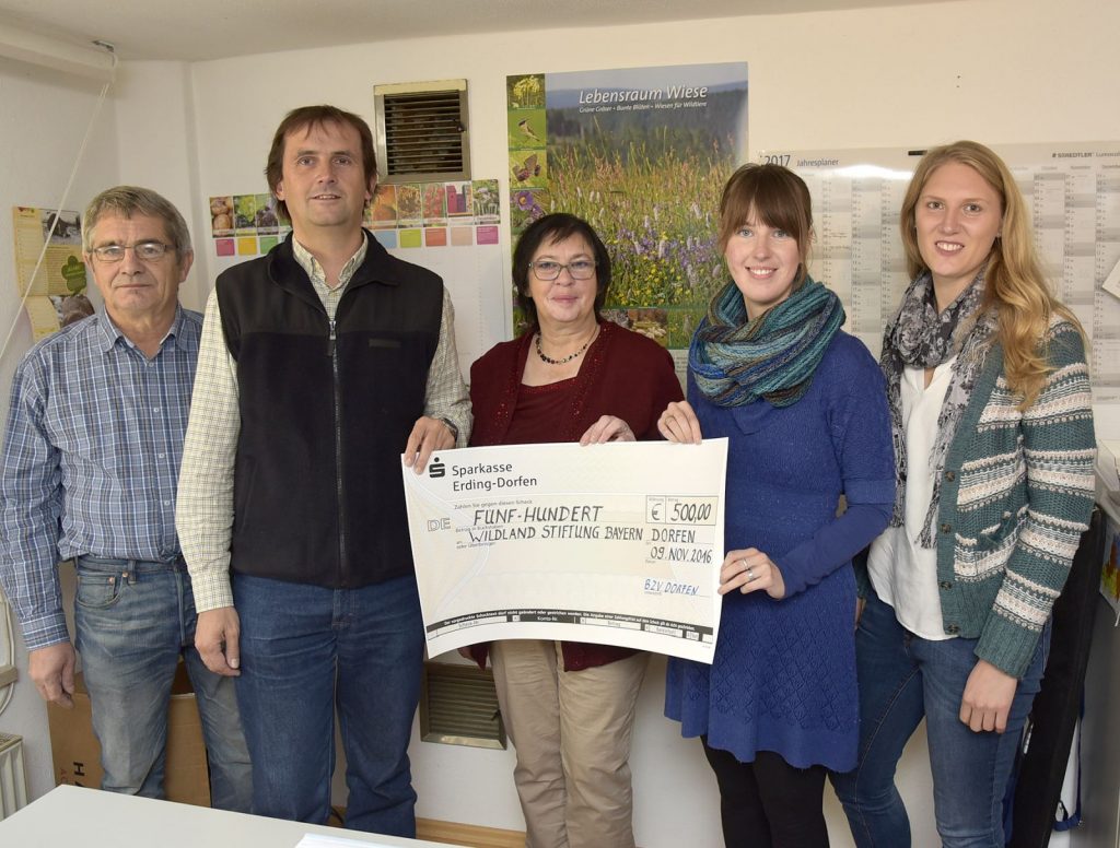 Spendenübergabe durch Bienenzüchter Hans Huber, Herbert Schwarzer und Elke Krämer an die Projektbetreuerinnen Gabi Nikles und Anja Thole (v.l.) © H. Weingartner