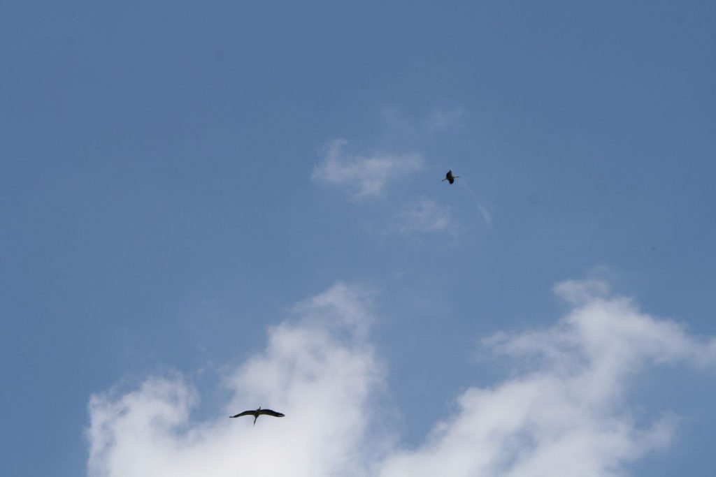 Zwei kreisende Störche über dem Dorfener Moos (Foto: E. Lindner)