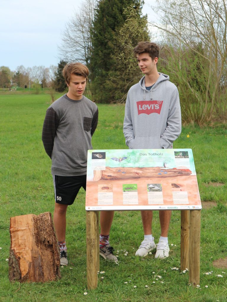 Schüler stellen die Lebensraumtafel zum Totholz vor