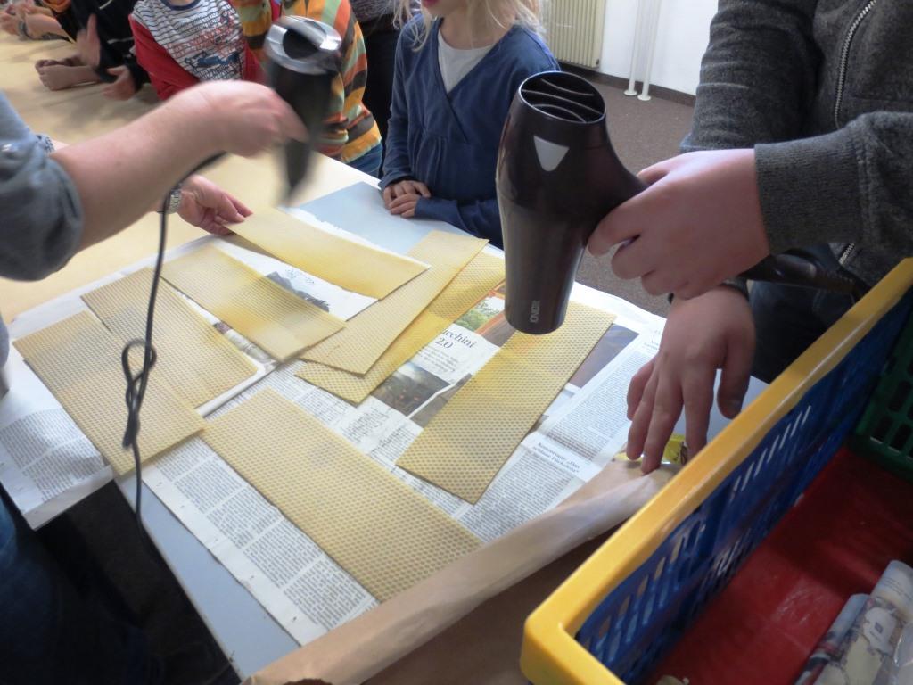 Los ging es mit dem Erwärmen der Bienenwachsplatten.