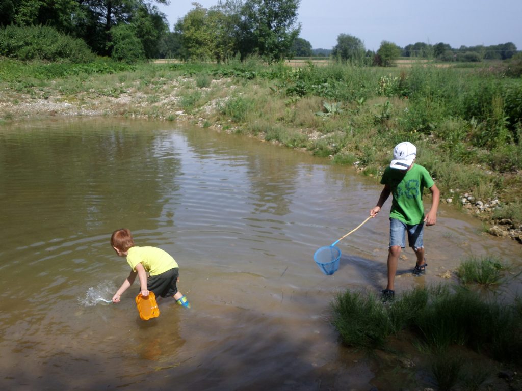 Die Kinder keschern nach kleinen Wasserbewohnern.