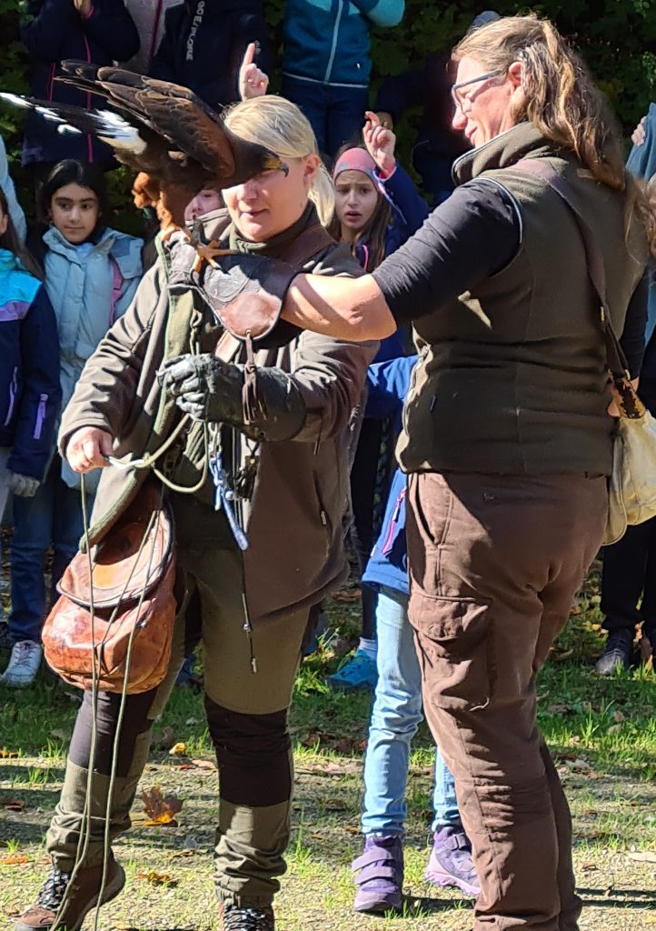 Im Oktober 2025 konnten wir bereits die ersten Schüler einer Grundschule aus München begrüßen und es sind weitere Termine bis 2026 gebucht. Die beiden Jägerinnen Sonja Hundhammer von der Jagdschule Hundhammer und Michaela Löffl, Öffentlichkeitsreferentin der Kreisgruppe Mühldorf am Inn, haben mit ihrem umweltpädagogischen Bildungsangebot „Schlaufüchse“ sowie der Unterstützung durch die Wildland-Stiftung Bayern und deren Kreisgruppenvorsitzenden Sascha Schnürer ein interessantes und erlebbares Programm zusammengestellt, was alle Sinne der Kinder schärfen soll. Neben einem Pirschpfad, auf dem die Kinder Spuren von Wildtieren entdecken und zuordnen konnten, wurde der Lebensraum von Wildtieren erkundet, die Nahrungskette aufgezeigt und auch die Rolle des Menschen besprochen. Es war den Jägerinnen besonders wichtig, den Kinder die Verantwortung jedes Einzelnen für die Umwelt aufzuzeigen und Pflanzen, Pilze und Tiere mit Respekt zu behandeln. Beim Tierweitsprung durften sich Schüler wie Lehrer mit der Sprungweite von Hase, Fuchs und Reh messen. Ein besonderes „Zuckerl“ für die Kinder hatte Sonja Hundhammer noch dabei: Nach dem erlebnisreichen Programm zeigte die Falknerin den Kindern ihre Wüstenbussard-Dame „Rapunzel“ und der spannende Tag endete mit einer kleinen Greifvogel-Flugschau. Die Schüler waren begeistert und unser Anspruch wurde mehr als erfüllt. Der „Treffpunkt Wildland“ in Waldkraiburg ist wiedererwacht.